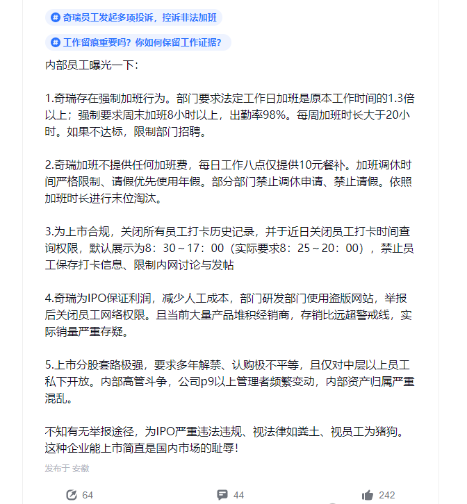 不知道这次的舆论风波会否对其上市产生影响?目前,奇瑞方面还未对此次加班风波回应。