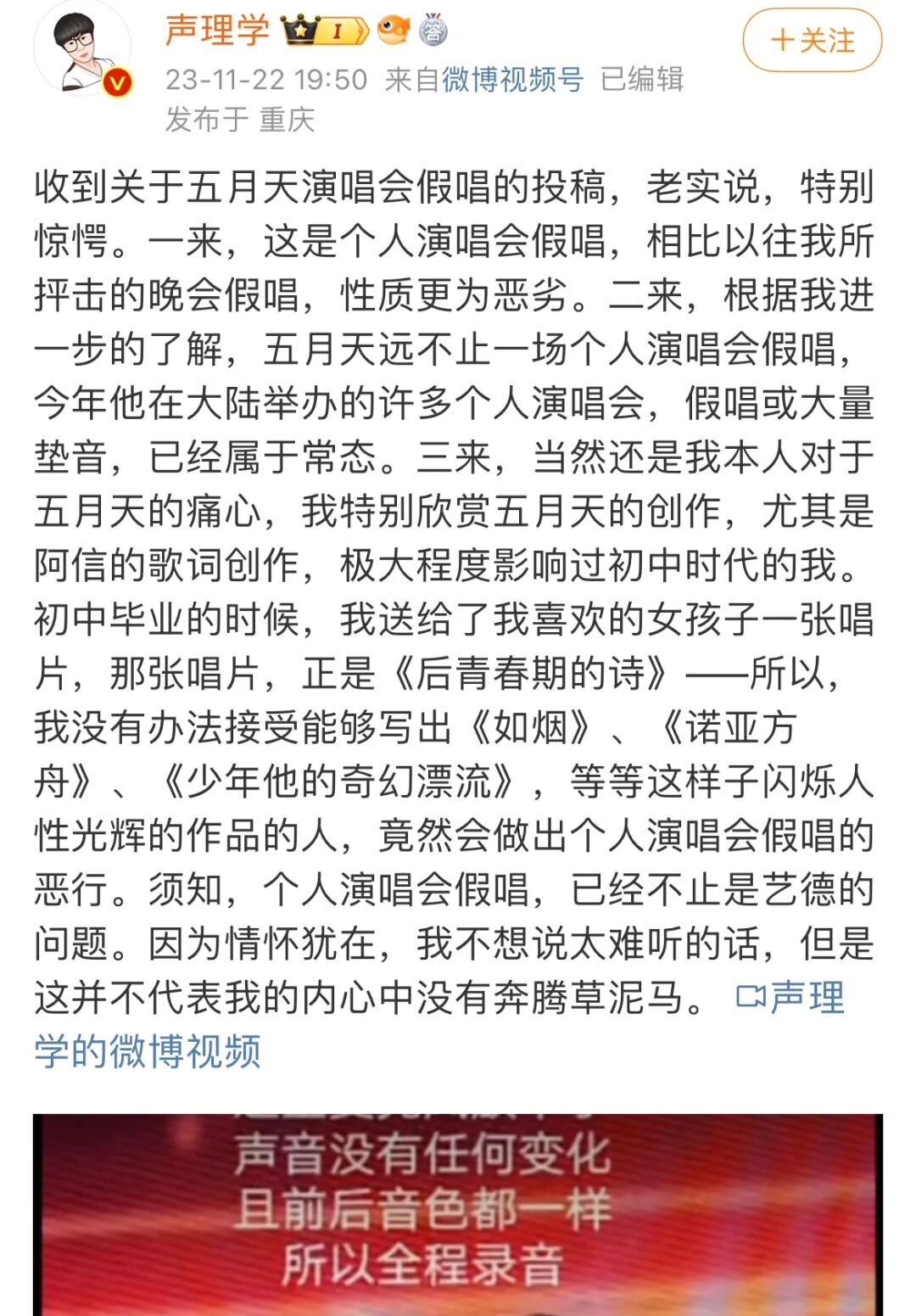 后来,11月22日左右,一位叫“声理学”的博主根据粉丝投稿内容,做了一期“五月天假唱不应该”的选题,但也没有闹出太大动静。