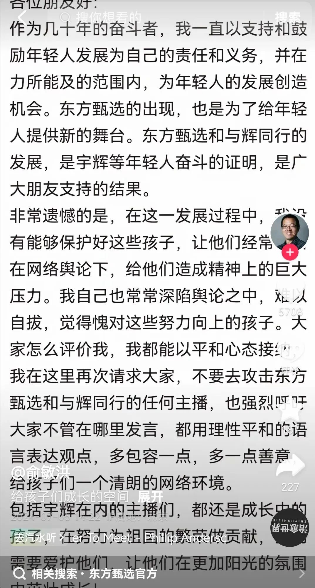 针对东方甄选近期一连串的风波,俞敏洪站出来,呼吁网友不要攻击东方甄选和与辉同行的主播。