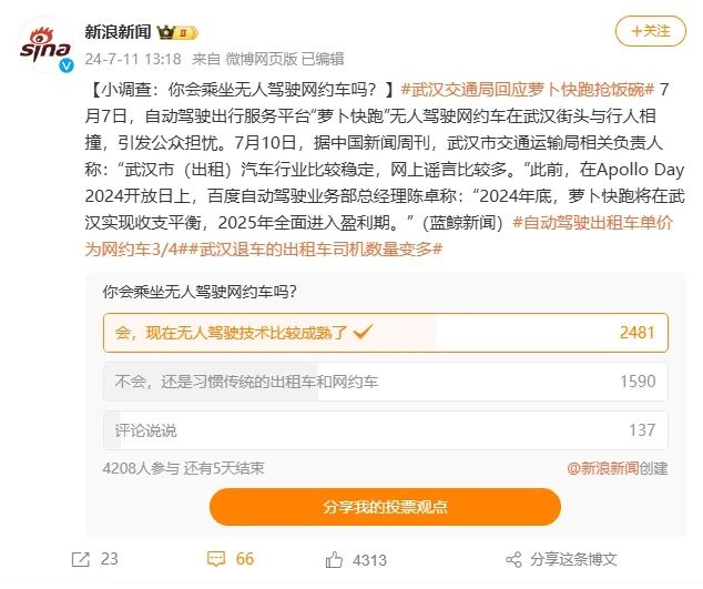 在超过4000人参与的关于无人驾驶网约车问卷中,约59%的网友表示愿意去体验无人出租车。