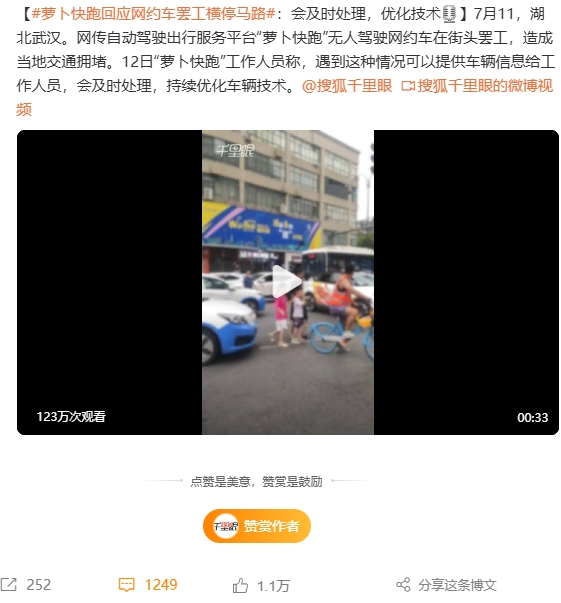 7月12日,“萝卜快跑”工作人员回应,遇到这种情况可以提供车辆信息给工作人员,会及时处理,持续优化车辆技术。
