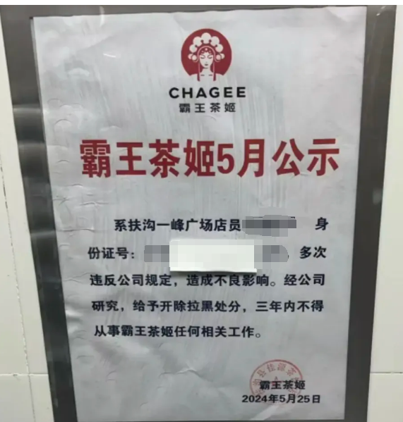被公示的员工随即在社交平台发文:从霸王茶姬离职后,被店方张贴身份证号公示,还表示上班时就被店长打压。