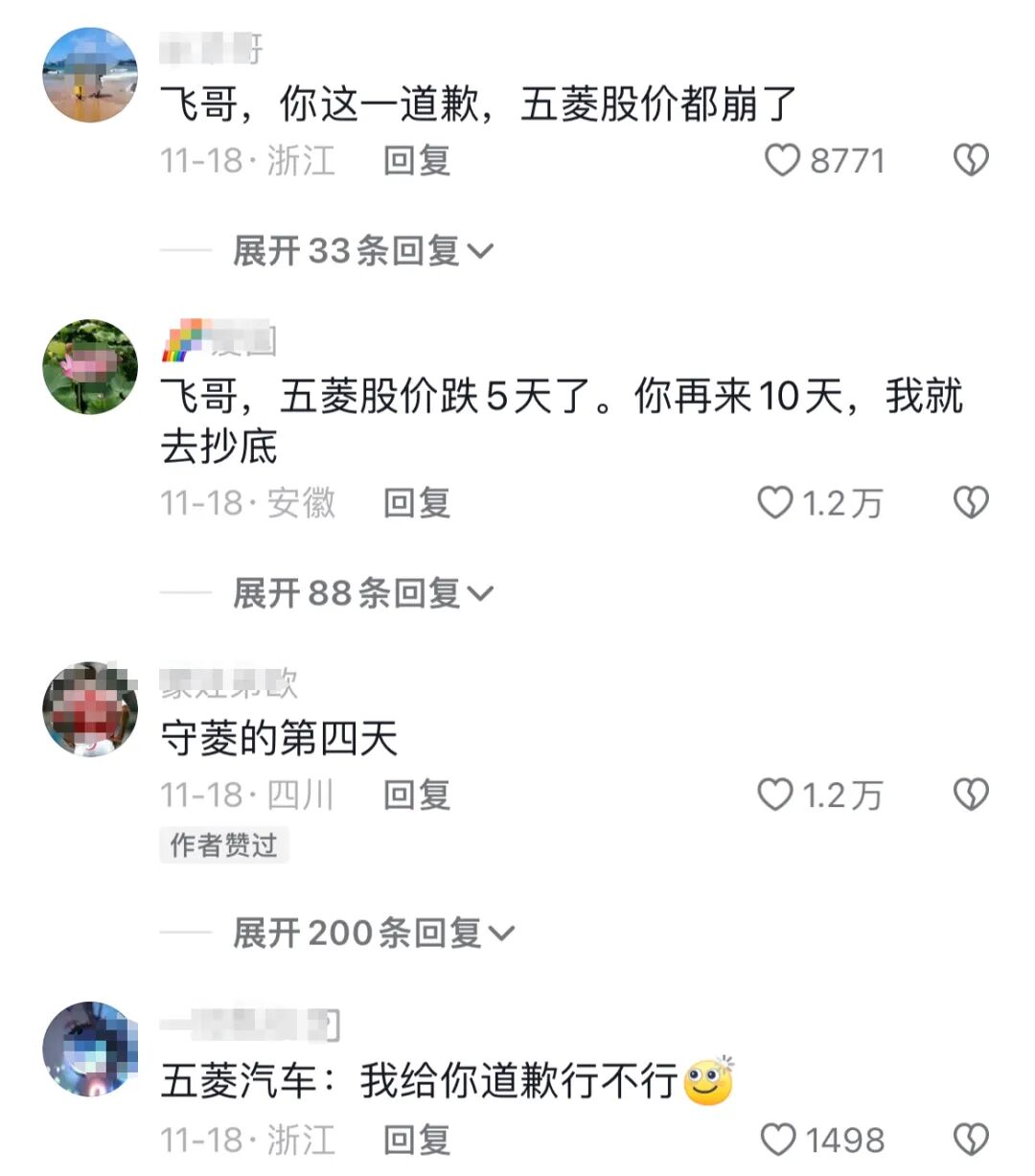 好巧不巧,五菱那段时间的股价也萎靡不振,因此有网友总结:飞哥道歉,带崩五菱。