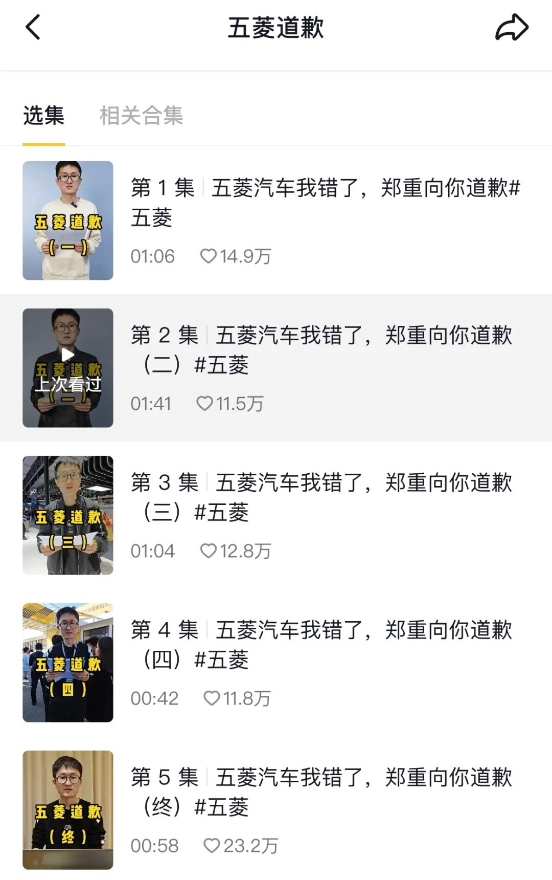 但在抖音上拥有293万粉丝的王飞,收到五菱“要求道歉15天的律师函”后,不墨迹也不头铁,一口气发了5个道歉视频,甚至专门创建了一个“五菱道歉”合集,大有把道歉当成连续剧来拍的势头。
