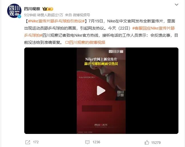 今天早上,因为宣传片中出现舔舐乒乓球拍的诡异画面,耐克又被“骂”上热搜。