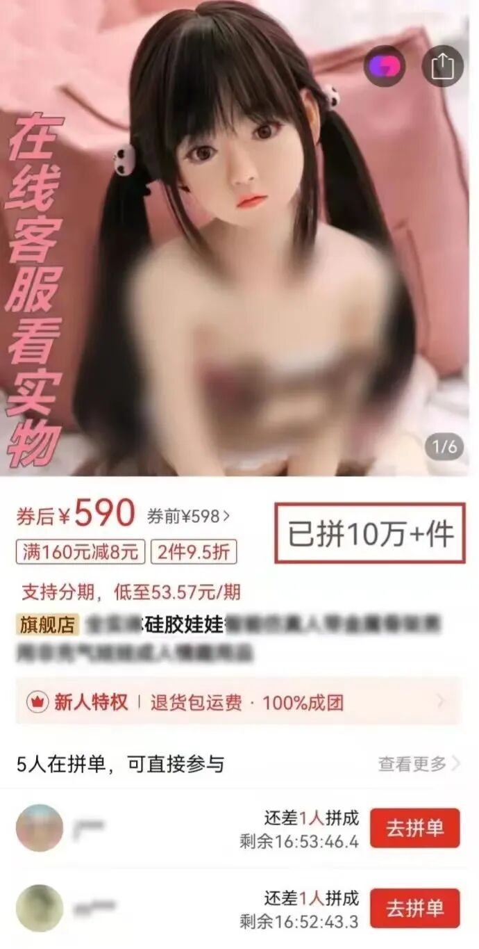 类似的情况淘宝上也有。搜索“充气娃娃”,进入店铺就可以看到很多产品图片上写着“联系客服看视频”、“客服有无遮挡视频”的提示,联系客服就能得到“无码视频”。