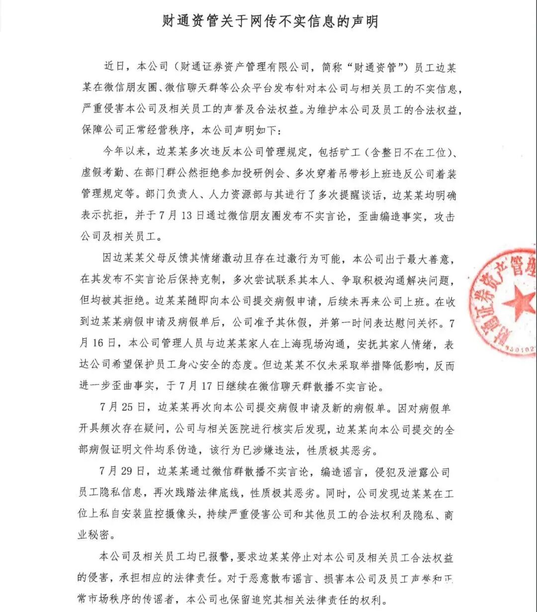 财通资管哪能坐得住,回应说边某某有旷工、虚假考勤、拒绝例会、着装不当等问题,还私自装监控摄像头严重侵犯公司和其他员工的合法权益、隐私和商业秘密,财通资管和相关员工都报警了!