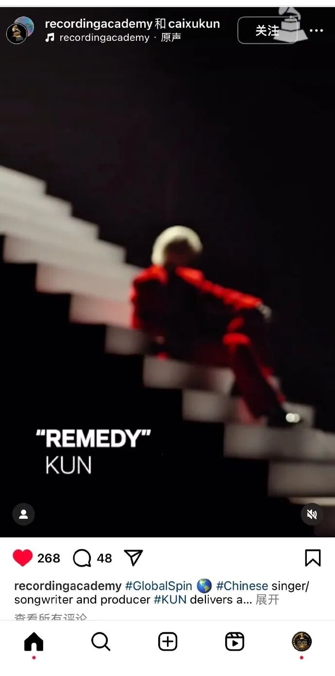 不过,格莱美旗下的 Grammy Global Spin频道确实发布了坤坤新歌《REMEDY》的现场视频。