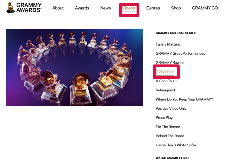 为了给这个事儿一个尽量客观的评价,我又点进了发布的链接。可以发现,这个 Grammy Global Spin,是格莱美官网里的子频道视频的其中一个细分分支。