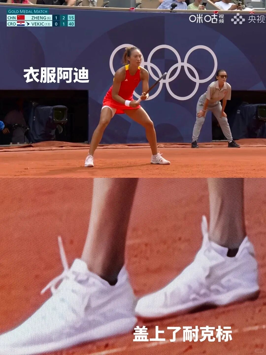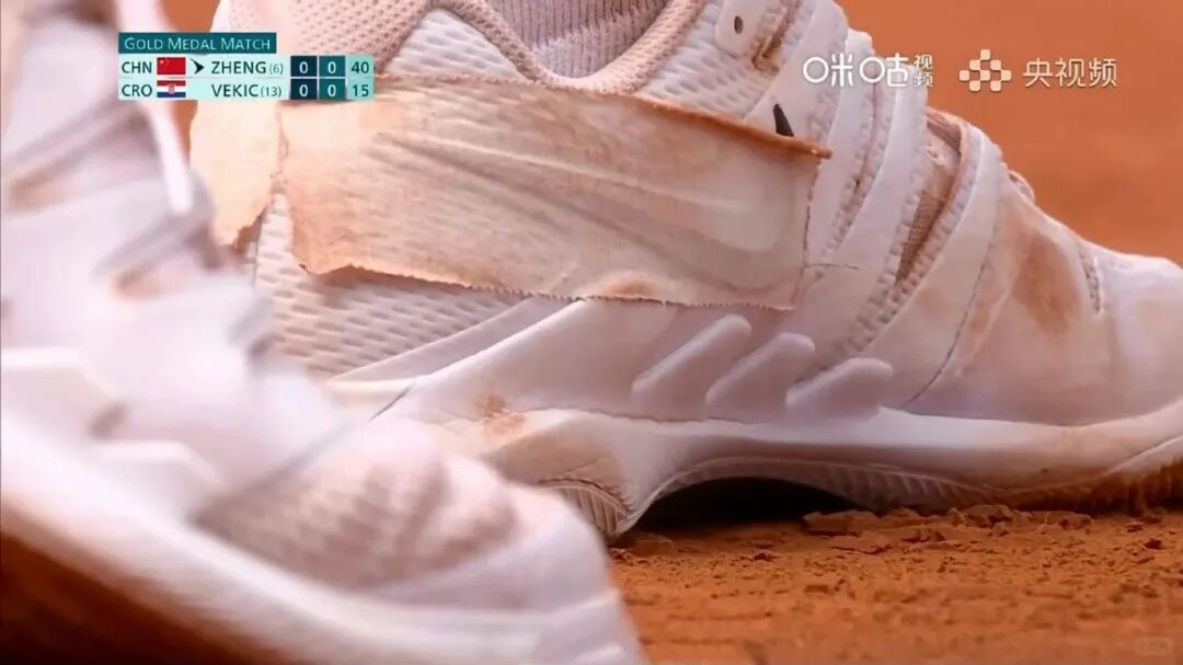 郑钦文夺金当晚比赛的国内外网友都有注意到:郑钦文脚穿的耐克(NIKE)球鞋,Logo 被白色胶条全部遮挡。