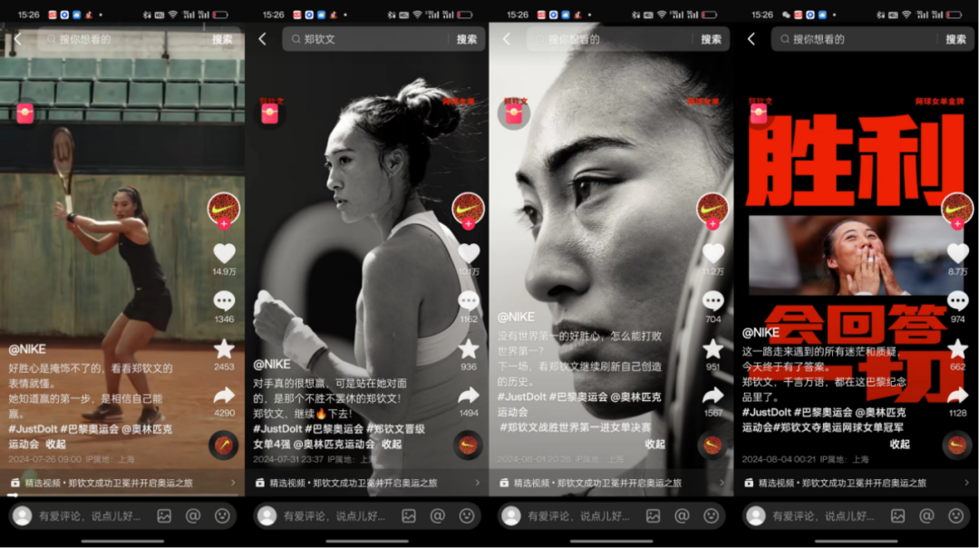 本次奥运会开始后,耐克就在各种传播渠道上跟踪郑钦文的比赛动态,并配合其代言广告传播,以取得最好的品牌营销效果,并在郑钦文夺冠后第一时间开启传播,准备做的相当充分,而现在也收到了巨大的回报。