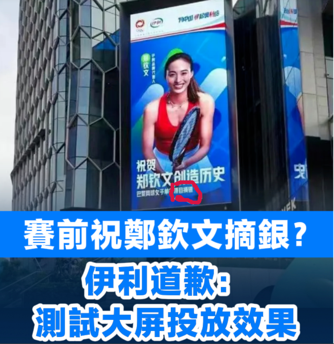 或许是过于急切地想要抢占先机,或许是对比赛结果过于自信,同样押宝了郑钦文的伊利,却提前在北京三里屯刊登广告:庆祝郑钦文摘银?!!