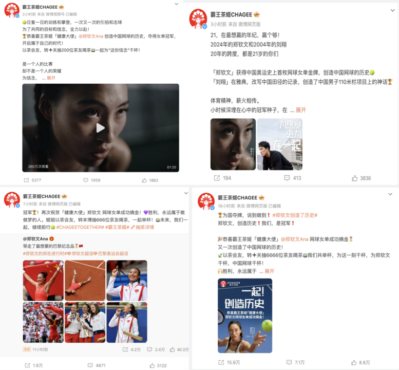奥运开始后,霸王茶姬通过微博、抖音、小红书、B 站等社媒跟踪传播郑钦文赛事成绩,并发起抽奖转发和免费赠饮等活动来推高热度。