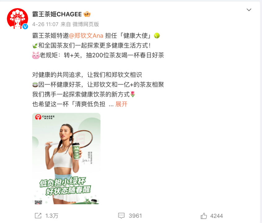 在官宣邀请郑钦文担任健康大使后,霸王茶姬一直持续传播郑钦文的相关内容。