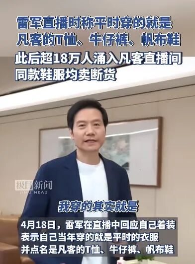 在一场主题为“不带货,就聊天”的直播中,雷军介绍小米汽车的交付情况,仅因身穿西装搭配白色 T 恤,再加上牛仔裤的打扮,就瞬间吸引了网友们的注意。
