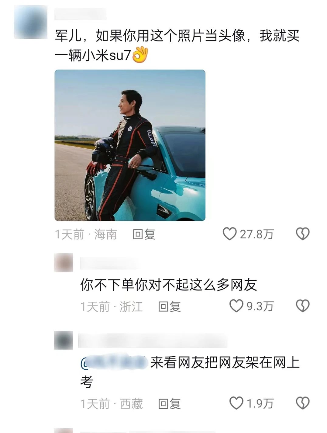 还有网友贴出雷军身穿赛车服的摆拍照片,称如果雷军用这个当头像,自己就买一辆小米 SU7。