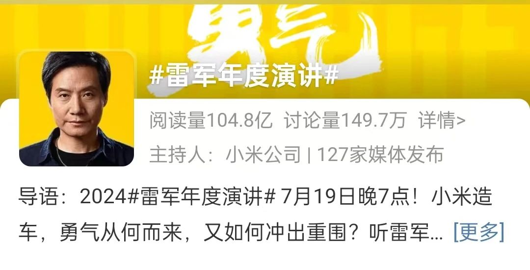 微博上,“雷军年度演讲”的话题阅读量超 100 亿,讨论量达 140 多万,直播回放的观看量接近 4500 万。有关其演讲的内容、金句,也在公众号、朋友圈疯传。