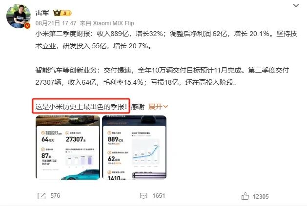 总收入 889 亿元,同比增长 32.0%;净利 62 亿元,同比增长 20.1%,雷军骄傲地宣称这是小米历史上最出色的季报。