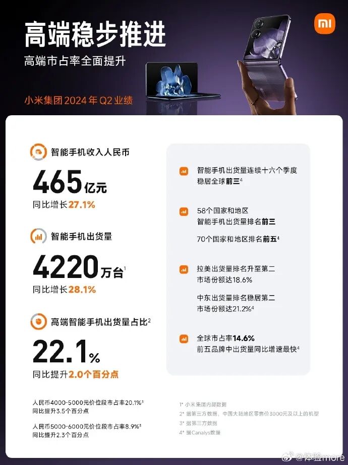手机业务一直是小米的基本盘。本季度营收 465 亿元,出货量达到 4220 万台,同比增长显著,成绩斐然。