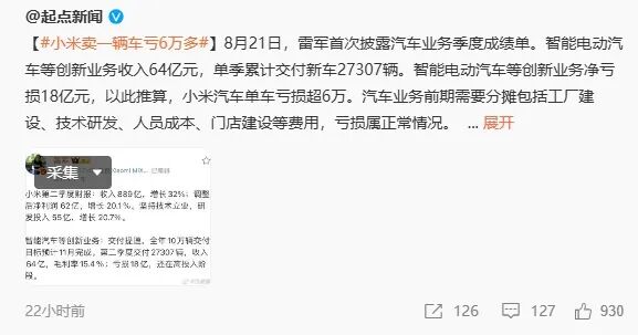 小米汽车无疑是此次财报中的焦点,而财报中营收 64 亿,亏损 18 亿引人注目,#卖一辆车亏 6 万多#的话题更是瞬间登上热搜。