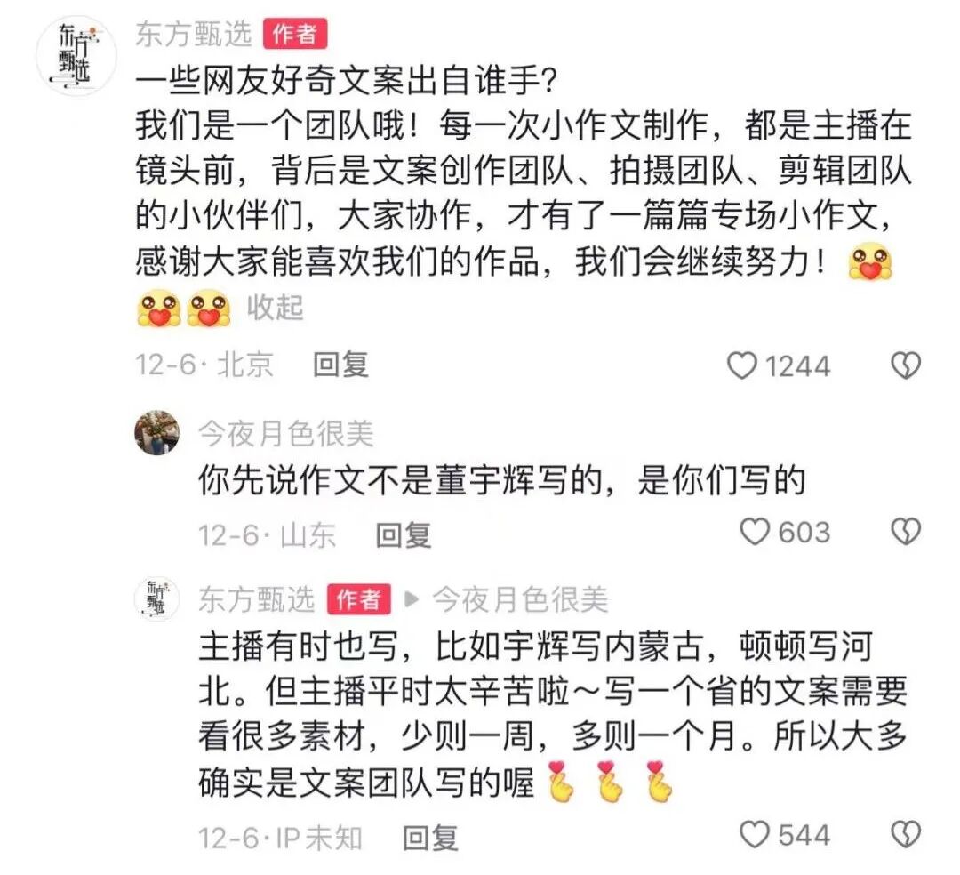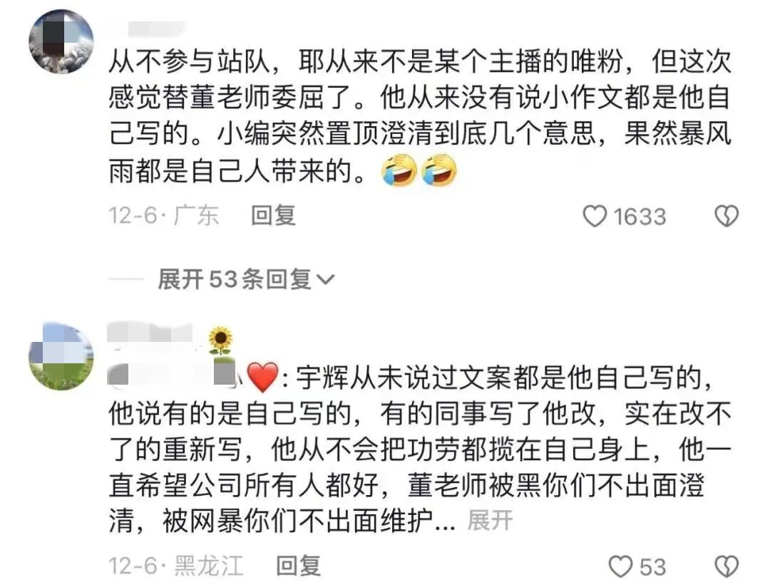 1、导火索是,某天东方甄选后台团队莫名其妙置顶了一条评论,大意是:董宇辉的众多神级文案,不是董宇辉所写,而是他们文案团队操刀的。