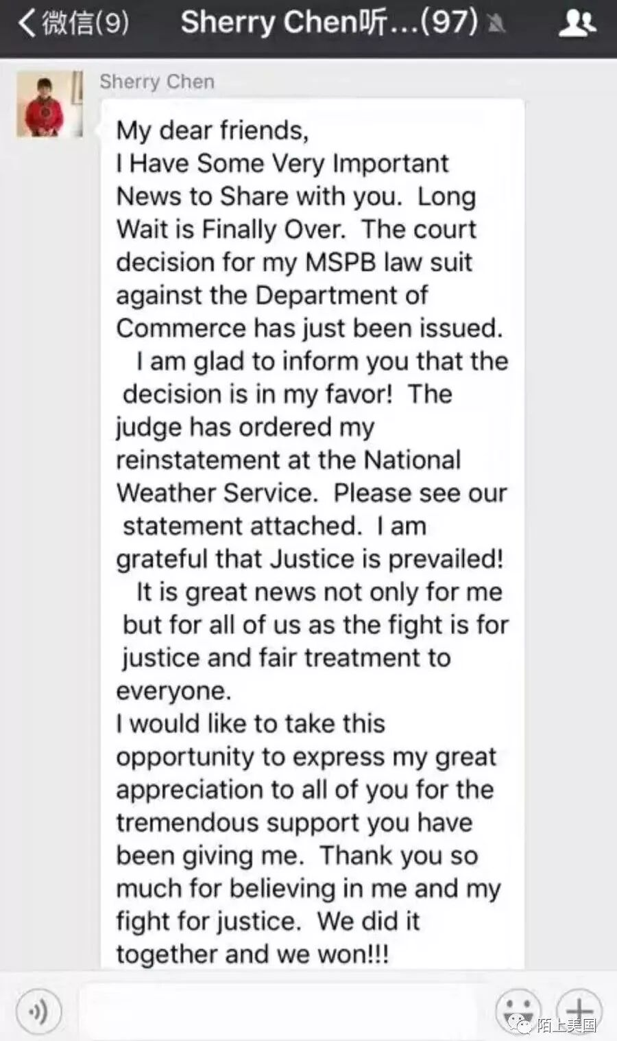 “正义得到伸张!美国是案例法,类似的迫害不能再有了。我们所有的在美华人都要感激陈霞芬的执着和牺牲,她为我们赢得了一个成功的案例。”