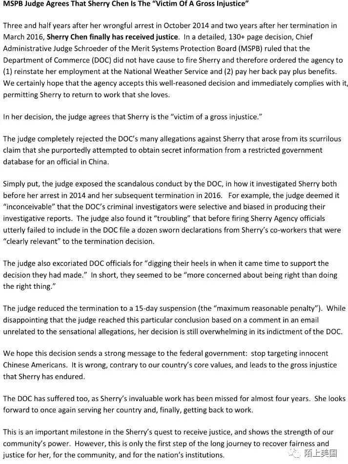 MSPB特别强调,“希望此案给美国联邦政府传达一个明确信息,停止对无辜的美籍华人的无端指控,这种行为是极其恶劣和错误的。是对美国精神和价值观的背叛,也是对陈霞芬本人的严重伤害。”