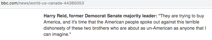 前民主党参议院领袖哈里·里德(Harry Reid)几乎整个政治生命都在与科赫兄弟作斗争,在他眼里,这两兄弟是大骗子,灼烧美国政治的火焰山,否认气候变暖的大路障。