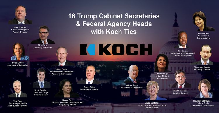 但是,这些毕竟只属于保守派的内部矛盾。有人算了一下,在川普的内阁成员中,其实有多达16人与科赫兄弟有着千丝万缕的联系。其中,国务卿彭比奥(Pempeo,图中左上第一个)跟科赫兄弟关系最铁,从他结束学生时代从西点军校毕业开始,遇到的第一个贵人就是科赫兄弟。可以毫不夸张地说,彭比奥从政有多久,他做科赫集团的“政坛大使”就有多久。