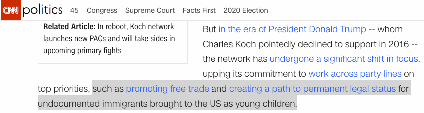 不过对于川普,一开始科赫兄弟算不上积极支持者。2016年大选前,查尔斯评价希拉里和川普时说过一句话暴露了心机,“癌症和心脏病之间的选择”。科赫兄弟是传统保守派理念自由贸易的信徒,这点跟满世界打毛衣站、讲究贸易保护、孤立主义的川普八字不合。他们也是为无证移民DACA人群(青少年时代跟随无证父母来到美国的人,全美约有200万;其中约有80万已经成年)谋求合法身份的积极推动者。他们对无证移民的支持,也带有降低公司运营成本的经济利益的因素在里面。