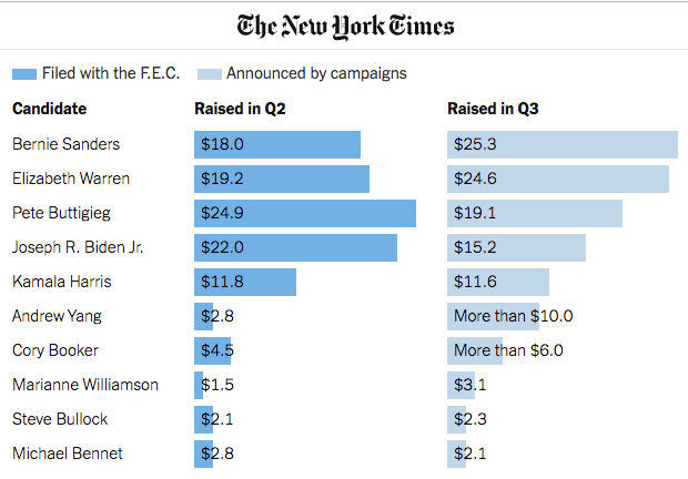 从近期的民主党选情变化来看,一个显著特征就是左翼进步派(progressive)上升势头强劲。最新发布的第三季度各候选人筹款数字显示,两位progressive掌门人Sanders和Warren获得了最多捐款,超过了建制派的最大热门Biden和被寄予厚望的新生代Buttigieg。