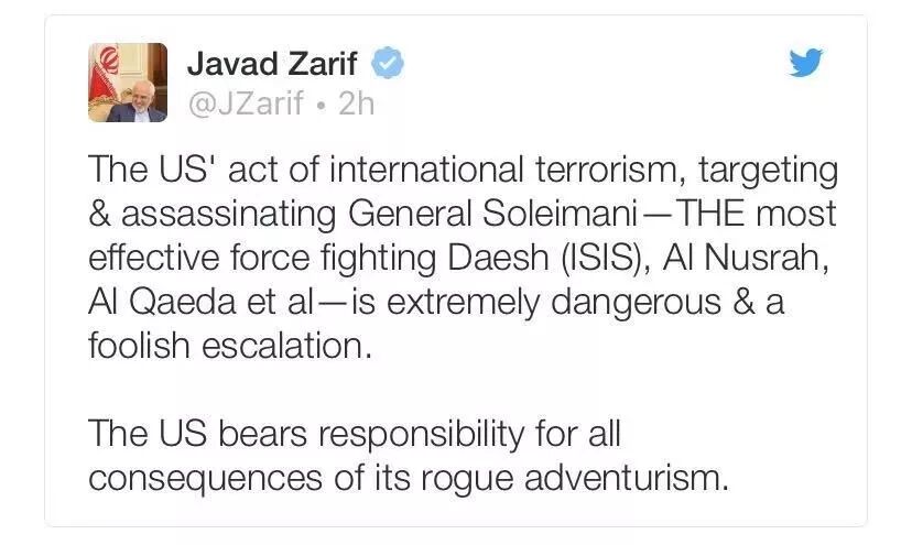 当天伊朗外交部长扎里夫称“美国的鲁莽行为极端、愚蠢且无知,因为莫罕德斯将军曾经为打击ISIS、征服沙姆阵线、基地组织等穆斯林极端组织立下汗马功劳”的话,是通过推特发出来的。