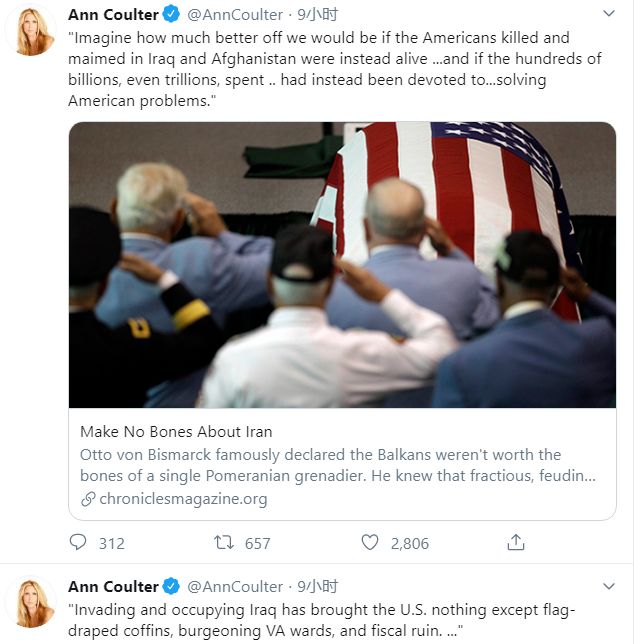 如果这次斩首行动是川普倒向共和党建制派石化军工势力和军方鹰派人物的信号,那么他也面临自己的支持者分裂重组的问题。比如Ann Coulter这样的右翼反移民立主修墙派就此事发表意见,都表示反对战争。