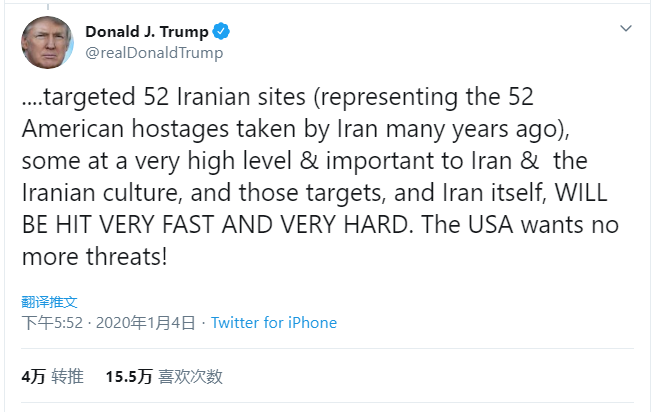 川普今天隔空对骂,称“美国拒绝被威胁,如果伊朗袭击美国人或者美国资产,美军将对52个伊朗的重要地点(这代表在1979年伊朗劫持美国驻伊朗使馆的52个人质),包括政治军事要地和伊斯兰文化重地,进行毁灭式打击。”