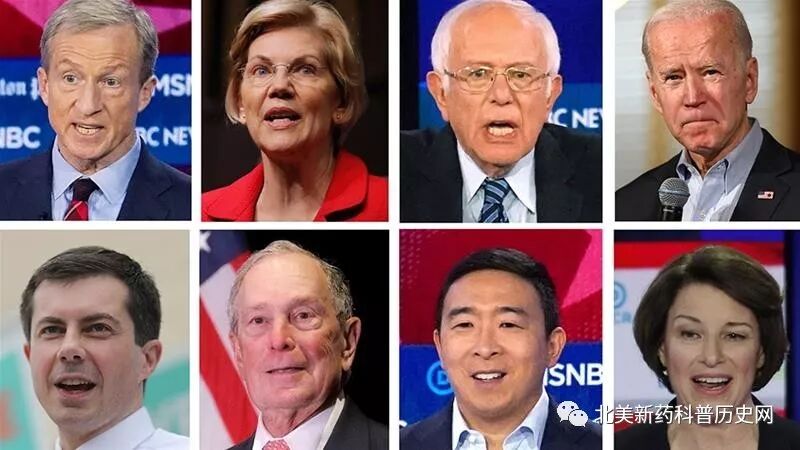 前副总统拜登,参议员桑德斯,女参议员沃伦,女参议员克罗伯查,市长布特哲支,前纽约市长亿万富翁布隆伯格,亿万富翁斯代尔,和杨安泽。