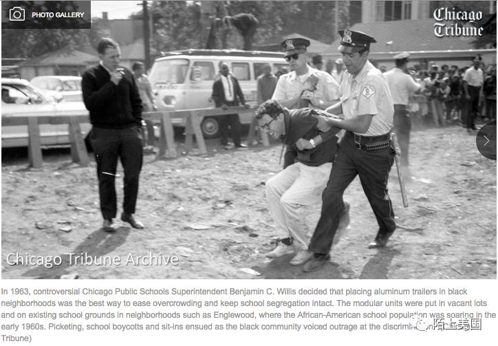 同年在芝加哥,为抗议学校种族隔离,他冲到了...警察的胳膊下。