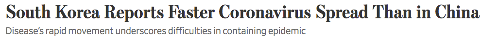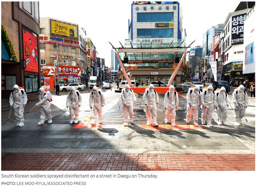 韩国首次报告病例日增幅超过中国,成为除中国以外受冠状病毒感染最严重的国家。截至周四下午,一天增加505例新感染病例,全国总数达到1,766例,约有一半与大邱市的耶稣新天地教堂有联系。韩国的第四大城市大邱就是另一个武汉。