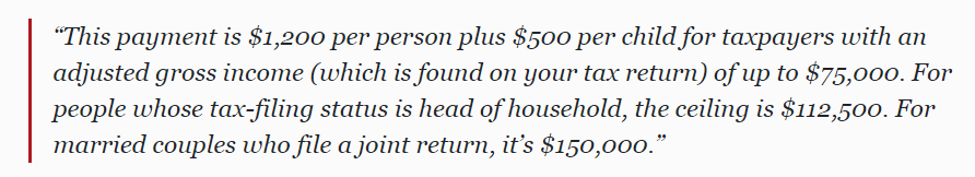 CARES法案授权了“天降美元,(居民)人人有份”。此项救助花费3010亿美元,目标就是把经济停下来数周,政府买单让人安心宅家里,不要惦记出门赚钱,以保障社交距离和居家令的顺利实施。只要符合美国税务定义上的居民的概念,每名成人最多可获得1200美元,每个小孩(17岁以下)最多可获得500美元的支票。一个四口之家最多可以拿$3400。全美有数千万个家庭能从中受益,保障经济停转期间维持财务支出的基本生活费。截至4月底,“山姆大叔”(对美国政府的戏称)已经发出了8800万张支票,同时还在准备几百万张,继续寄。基于2018或者2019年的税务申报,调整后的年收入(Adjusted Gross Income,AGI)在$75,000的个人,或者报税身份为户主且AGI在$112,500以下的个人,以及AGI低于$150,000的家庭,都能收到全款支票。