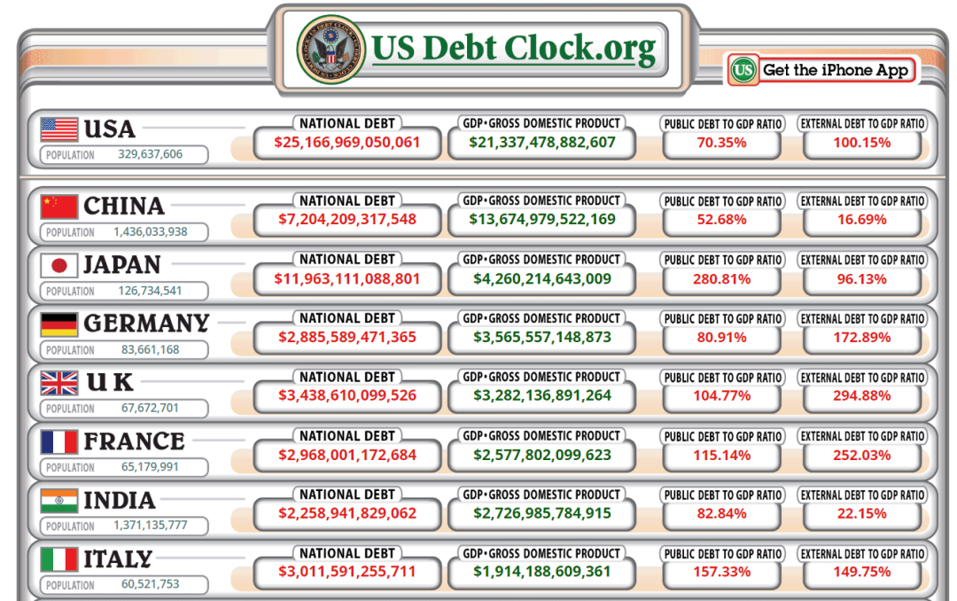 美国政府的公众国债已经19.05万亿美元,占到GDP的70%(注:维基百科上说是79%)。这19.05万亿美元中有37%是向海外举债,中国持有约7%的美国国债。不过发达国家很多都是借钱消费,比一比,国债问题上,美国比欧洲国家还算矮子中拔尖的。比如法国的公众国债占GDP比例是115%,英国是105%,意大利是157%。而日本已经高达280%。