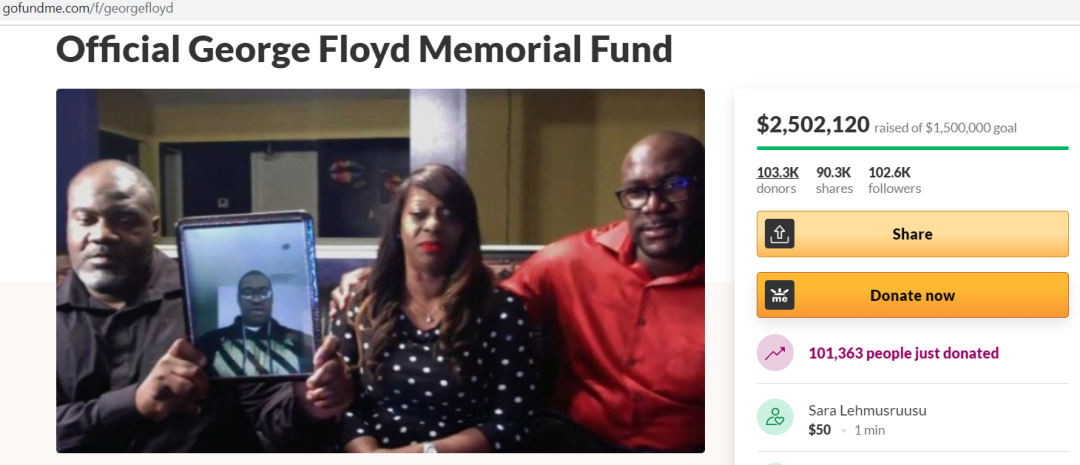 一边是对逝者和家庭充满同情的网络陌生人。周四在乔治的亲兄弟开通Gofundme捐款,为他筹集葬礼和孩子的抚养费后,仅仅两天时间内,捐款人数达到10万多人,总量突破250万美元。