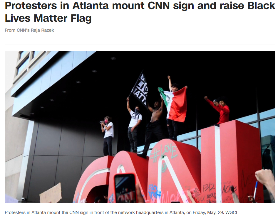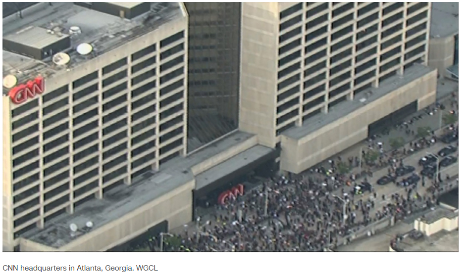 在亚特兰大,CNN报道了自己总部遭遇破坏,抗议者涂鸦并砸碎了CNN总部的玻璃的过程。