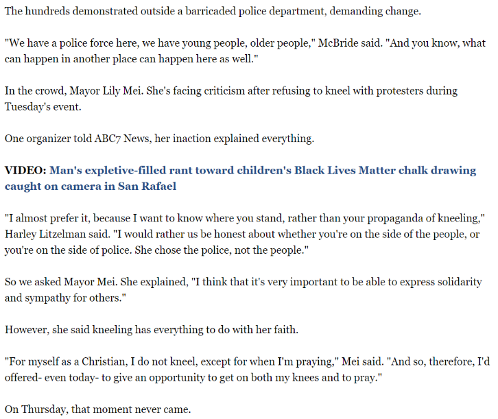 当BLM和华裔利益产生冲突的时候,媒体和Social Justice Warriors们站在哪一边?日前加州Fremont市市长Lily Mei与警长拒绝示威人群的下跪要求,于是被当地媒体渲染和示威者在网络上攻击。选择不下跪有很多的理由,甚至也有一个“政治正确”的理由:下跪在亚洲文化中是一个卑躬屈膝的符号。当这些人攻击Lily Mei市长的时候,他们是不是没有尊重亚洲文化?一时间他们似乎变成要将“美国文化”强加于人的“红脖”了。
