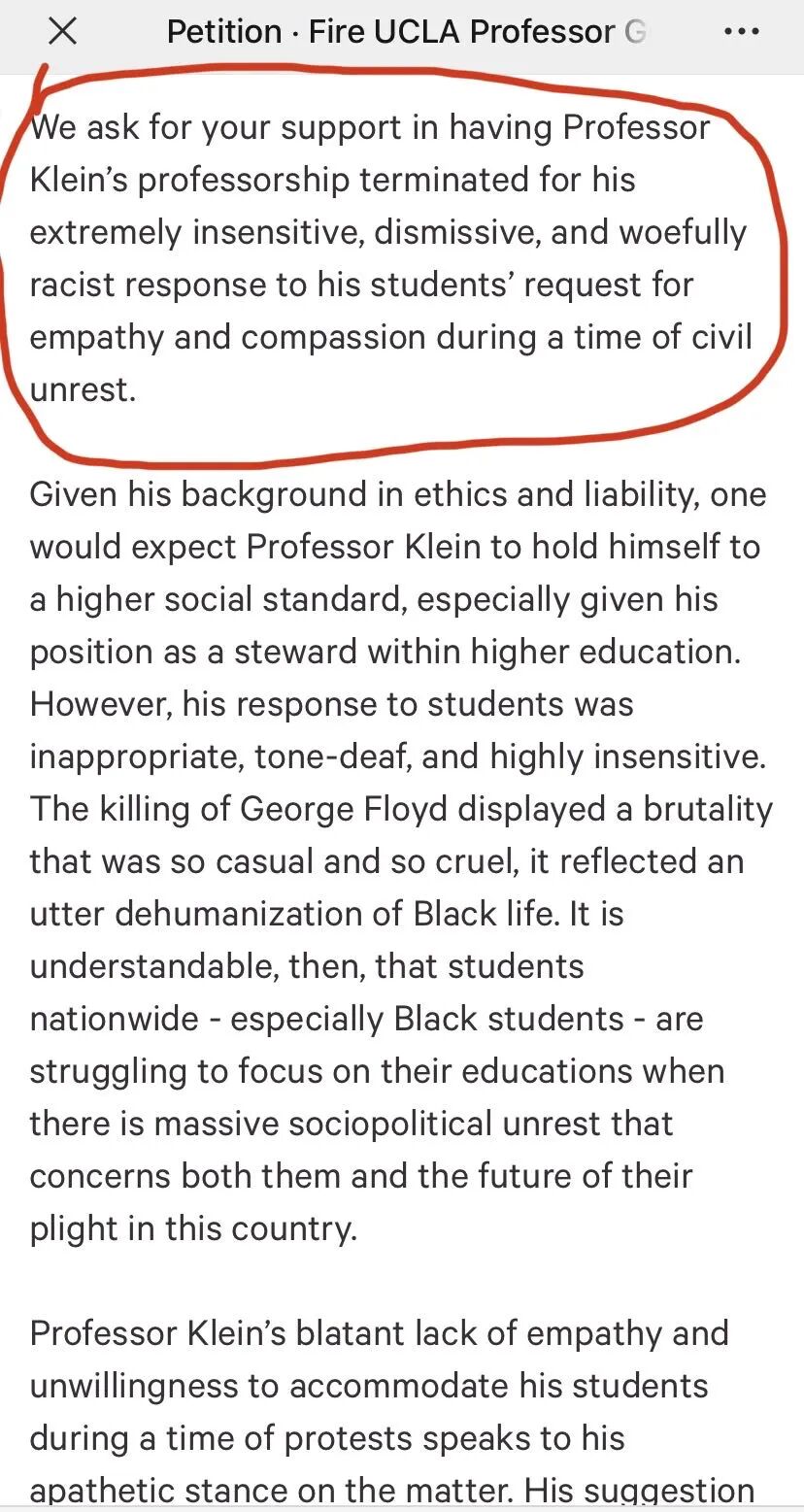 这个请愿中,学生称克莱恩教授的回应是“极度麻木,轻蔑和种族主义”。目前已经有2万多参与签名。
