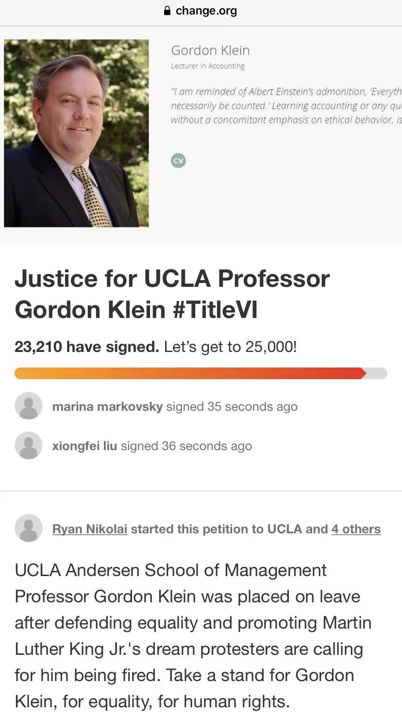 这么说不是危言耸听,今天另外一则新闻引发广泛关注。美国著名大学加州大学洛杉矶分校的一位担任讲师的教授,戈登·克莱恩(Gordon Klein)被停课,其课程由其他老师代理。理由是被投诉他有“可悲的种族言辞”。