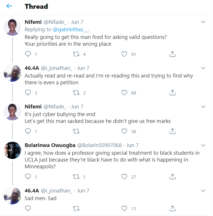 在发起学生的推特下,有各种评论留言,引人注目的是,点赞排在前面的留言中对解雇教授做法持疑问或反对意见的,恰好是非裔学生: