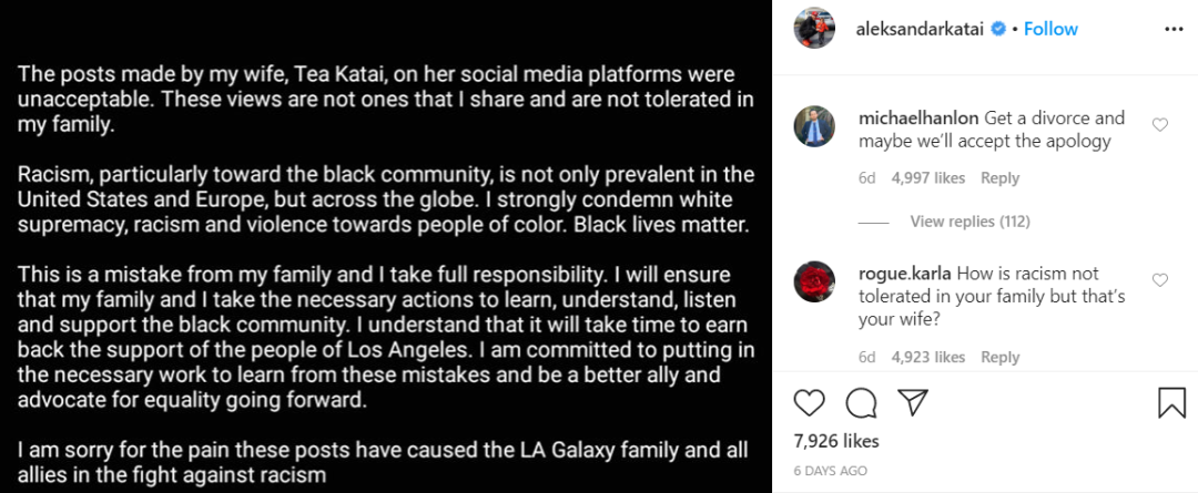还是洛杉矶,据美联社报道,当地银河足球队的一名球星亚历山大·加泰(Aleksandar Katai)的妻子,用塞尔维亚语在社交媒体上公开称抗议者为“恶心的牛”,并用亵渎他们的话,称要“杀死”他们。
