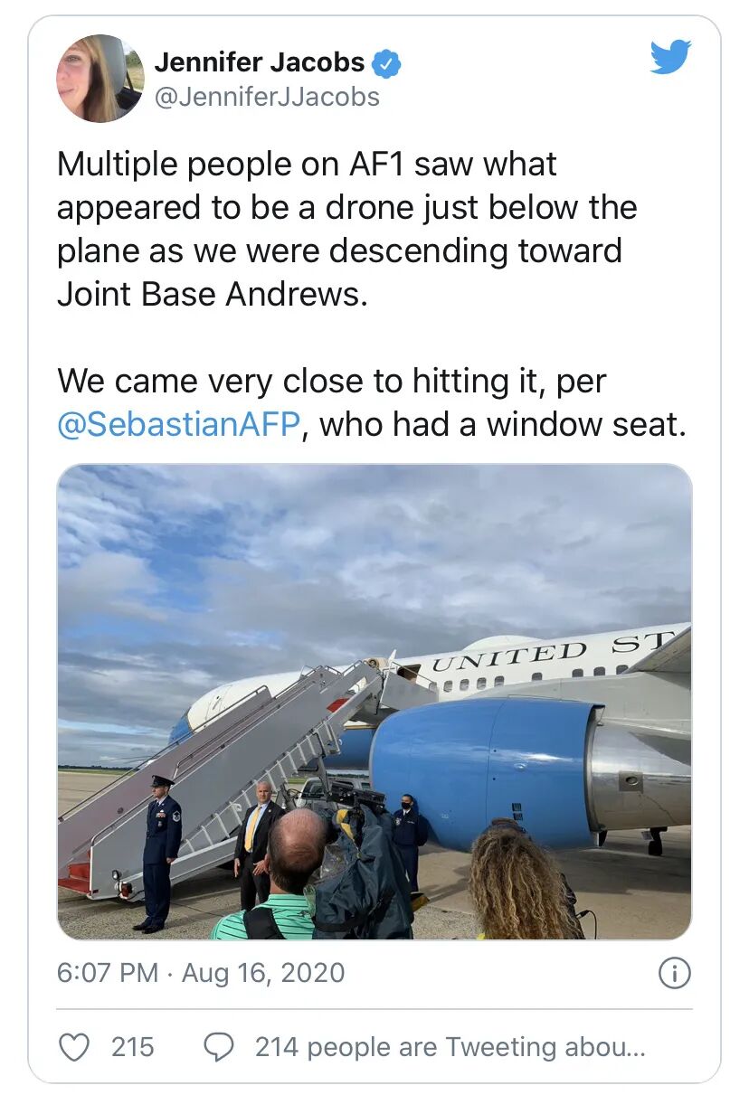 另一位随行人员也发推特证实,飞机上多人同时看到一个高度疑似无人机的不明飞行物,几乎贴着空军一号从飞机下方而过。