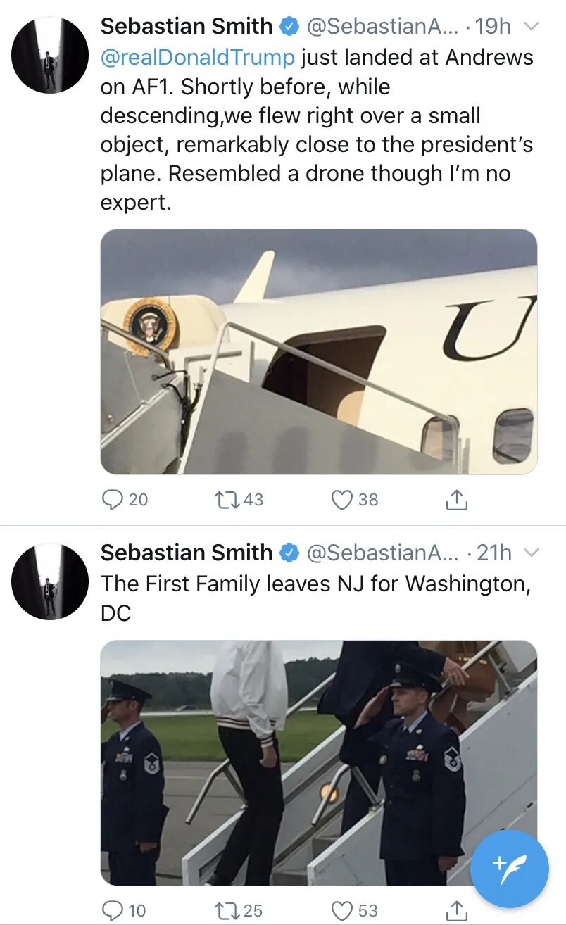 根据空军一号记者塞巴斯蒂安·史密斯(Sebastian Smith)的推特描述,川普及家人从新泽西出发飞回首都华盛顿特区。在飞机将要降落的途中,机组报告,意外发现一个疑似无人机的小型飞行物。