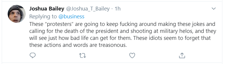 “这些'抗议者'将继续开玩笑,希望总统离世并向军人开枪,他们将看到生活可以变得多么糟糕。这些白痴似乎忘记了,此类行为和言论是叛国的。”