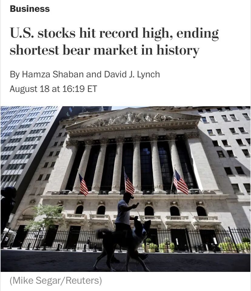 美国股市经历了126个交易日的震荡之后,今日摆脱熊市。标准普尔500指数(S&P 500)周二收于历史最高水平,该恢复速度是有史以来最快的一次。